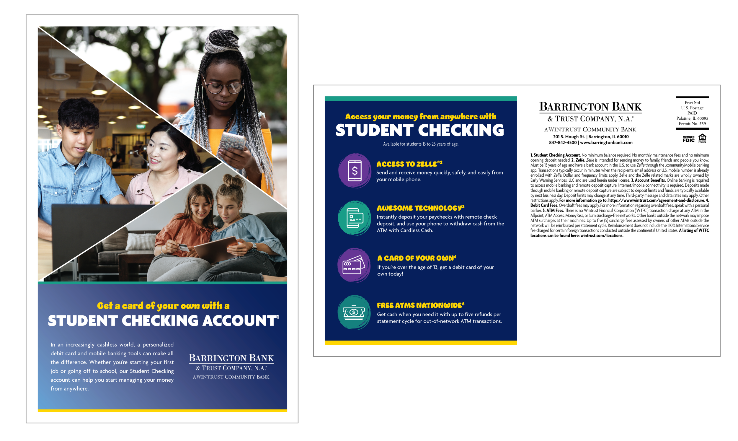 Design an eye-catching campaign to highlight our student checking advantages and perks to teens looking to access their money from anywhere with their own personalized debit card through Wintrust.